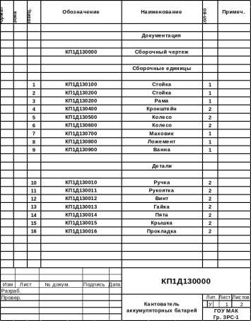 На верхней части стоек 2 установлены подшипниковые узлы, в которых поворачиваются полуоси 8 ложемента. Ложемент имеет окно для установки аккумуляторной батареи. Батарея к ложементу крепится с помощью прижимов. Ложемент с установленной аккумуляторной батареей можно поворачивать на любой угол вручную. При этом маховик 7 будет фиксироваться при углах поворота 90, 180, чтобы освободить замок маховика необходимо потянуть на себя маховик, при фиксации – надо отпустить его и он под действием пружины вернется на свое место.