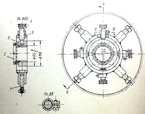 Визирная труба на фланце вала механизма крепится с помощью специального кронштейна. Для крепления и регулировки положения визирной трубы типа ВТ-3 на фланце вала механизма рекомендуется применять кронштейн, показанный на рис. 2. Он состоит из фланца 10, к которому приварена полка 9 с двумя опорами 7 для установки в них переходной втулки 4 с визирной трубой 8. Задняя часть втулки имеет шаровую поверхность и с напряженной посадкой входит в опору. Передняя часть втулки свободно перемещается во второй опоре двумя регулировочными винтами 1, позволяющими наклонять визирную трубу в вертикальной и горизонтальной плоскостях. Против регулировочных винтов в опоре установлены пружинные устройства 3, штифты 2 которых опираються на переходную втулку и удерживают ее в заданном положении. Для концов регулировочных винтов и штифтов на втулке имеются прямоугольные пазы.