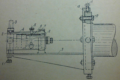 Смещение оси визирной трубы относительно оси вала устраняют путем перемещения кронштейна по плоскости фланца вала четырьмя регулировочными винтами 11. Кронштейн на фланце вала крепят четырьмя болтами 12. Визирную трубу закрепляют в переходной втулке с помощью трех винтов 5, под концы которых на корпус визирной трубы положена латунная прокладка 6, имеющая форму полуцилиндра. Плоскость и выточка фланца кронштейна обработаны на токарном станке соосно с расточенными отверстиями двух опор кронштейна, что облегчает центровку визирной трубы по оси вала при установке кронштейна на фланец вала механизма.