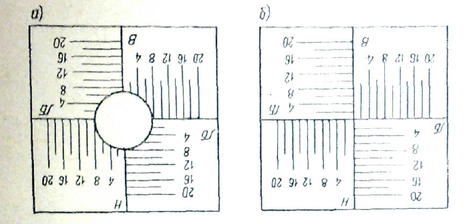 Путем гравирования на мишени наносят перекрестие с делениями через 2 мм и обозначения, указывающие положение мишени на шергене или переборке. Для лучшей видимости мишени в визирной трубе ее деления заливают черным лаком, а поверхность делают матовой. Одна из мишеней, ближняя (рис. 3 а), имеет в центре отверстие диаметром ~ 20 мм, что позволяет наблюдать дальнюю мишень без снятия ближней.