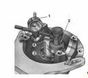 Рисунок 5.2 - Определение толщины регулировочного кольца ведущей шестерни: 1 — индикатор; 2 — приспособление А.95690; 3 — задний подшипник ведущей шестерни; 4 — оправка А.70184.