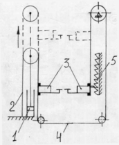 Рисунок 1 – кинематическая схема подъемника: 1 – гидроцилиндр; 2 – приводной трос (в других моделях - цепь) ведущей каретки; 3 – каретка; 4 – приводной трос (в других моделях - цепь) ведомой каретки; 5 – стопорное устройство (храповое или клиновое).