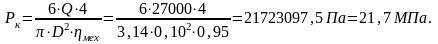 Перерасчитываем давление, необходимое для обеспечения усилия 27000 Н принятым цилиндром (D=100 мм).