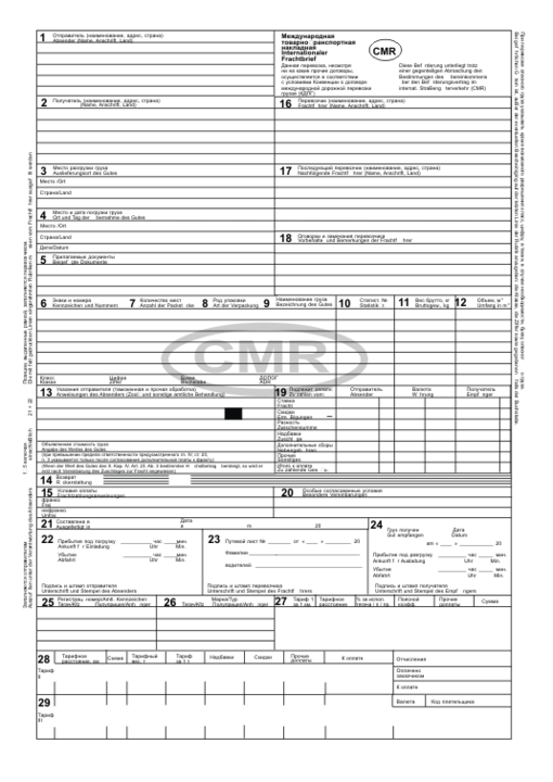 Помимо договора, в число главных документов грузоперевозки входит товарно-транспортная накладная (накладная CMR) (см. Приложение 1), которая должна содержать следующую информацию: