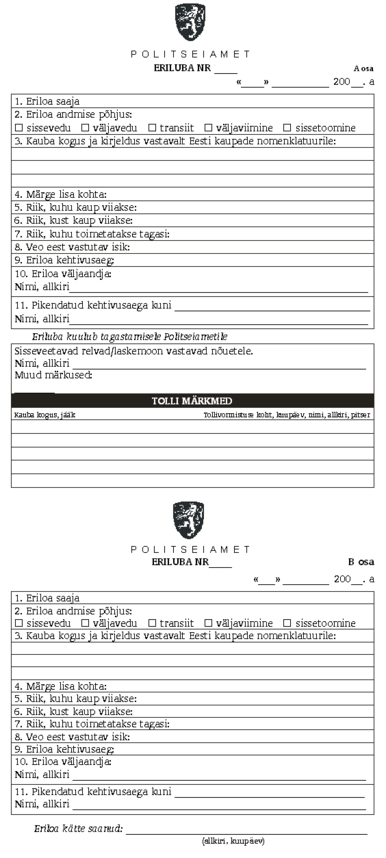 Цена специального разрешения представляет собой плату за оформление (100 крон) и плату за превышение наибольших дозволенных размеров и веса. В Эстонии при превышении двух или более допустимых размеров в расчет берется только самая высокая ставка за превышение размеров. Стоит учитывать, что при оформлении разрешения в срочном порядке (разрешение оформляется в течение 8-16 рабочих часов) его стоимость может увеличиться в три раза; если в течение 2-8 часов – в пять раз; если в течение 2 часов – в восемь раз (Palts, 2006).