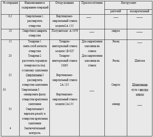 | 1-я схема: срыв резьбы в отверстии крепления сцепления 2-я схема: износ торцевых поверхностей, установка ведомого диска сцепления | Нарезание новой резьбы Протачивание | 1 2 3 4 5 6 1 | Сверлильная Сварочная Токарная Сверлильная Сверлильная Сверлильная Токарная | Торец Наружные цилиндрические поверхности, торец, Наружные цилиндрические поверхности, торец. Наружные цилиндрические поверхности, торец |