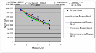Анализ значений R2 показал, что линейная зависимость наиболее адекватно отражает влияние фактора-признака «возраст» на результативный признак «стоимость».