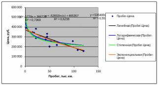 Анализ значений R2 показал, что экспоненциальная зависимость наиболее адекватно отражает влияние фактора-признака «пробег» на результативный признак «стоимость».
