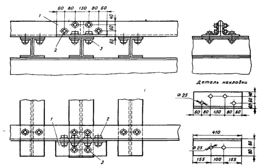 Для предупреждения провала колёс сошедшего с рельсов подвижного состава над поперечными балками устраивают переходные столики, а при контруголках и охранных уголках – подвесные мостики установленной конструкции. Конструкция стыка охранного уголка показана на рис.3.2.