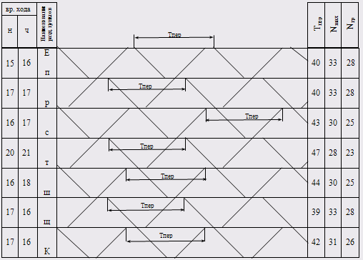 С левой стороны – размещение технических пунктов и время стоянок под операциями смены локомотивов СЛ, смены локомотивных бригад СБ, технического осмотра состава ТО, снабжения состава водой НВ. В этой же колонке пишется время хода пассажирских и грузовых поездов по перегонам в чётном и нечётном направлениях с указанием времени на разгоны и замедления при следовании поезда с остановками.