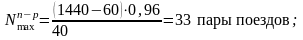 Nгрп-р = 33 – 1,4 2 – 1,4 1 – (1,8 – 1) 1 = 28 пар поездов;