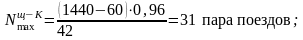 Nгрщ-К = 31 – 1,4 2 – 1,4 1 – (1,8 – 1) 1 = 26 пар поездов;