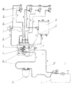 1 - топливный бак, 2 - фильтр грубой очистки топлива, 3 - трубки топливные низкого давления, 4 - подкачивающий насос, 5 - топливный насос высокого давления, 6 - трубка пневмокорректора, 7 - впускная труба, 8 - трубка перепускная, 9- трубка высокого давления, 10- форсунка первого цилиндра, 11- фильтр тонкой очистки топлива, 12- трубка сливная, 13 - клапан избыточного давления, 14 – пневмокорректор, 15 - электромагнитный клапан останова двигателя