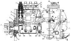 1 - секция топливного насоса. 2 - табличка; 3 - прокладка фланца, 4 - фланец; 5 - крышка подшипника; 6 - шпонка: 7 - полумуфта привода,8 - гайка крепления полумуфты; 9 - кулачковый вал; 10 - манжета крышки подшипника, 11 - прокладка крышки подшипника, 12 - подшипник; 13 - направляющий штифт толкателя; 14 - толкатель; 15 - корпус топливного насоса; 16 - топливоподкачивающий насос; 17 - шпилька кронштейна поддержки ТНВД; 18 - регулировочные параметры; 19 - кольцо подшипника; 20 - болт; 21 - кронштейн; 22 - рычаг останова; 23 - болт; 24 - корпус регулятора; 25 - крышка регулятора; 26 - крышка смотрового люка; 27 - болт регулировки минимальной частоты вращения; 28 - болт регулировки максимальной частоты крашения; 29 - рычаг управления, 30 - корректор по наддуву; 31 - шпилька; 32 - гайка; 33 - шайба.