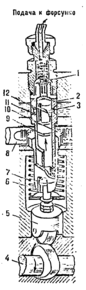 Клапан имеет разгрузочный поясок, который точно подгоняется к поверхности седла клапана. Когда нижняя кромка пояска дойдет до направляющей поверхности седла, происходит разобщение топливопровода с надплунжерным пространством втулки. При дальнейшем опускании клапана до полной посадки его в седло разгрузочный поясок освобождает небольшой объем над пояском. Вследствие этого топливо расширяется на величину освободившегося объема и давление внутри трубопровода падает. Благодаря этому происходит резкое окончание впрыска и уменьшается подтекание топлива из форсунки в цилиндр. Кольцевая выточка 9 на плунжере, заполненная топливом, обеспечивает смазку трущихся поверхностен плунжера 8 и втулки 2.