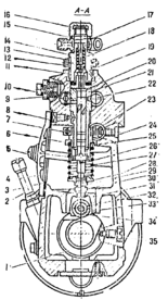 Плунжер получает привод от кулачка распределительного вала через роликовый толкатель 34. Толкатель имеет возвратную пружину 27 и регулировочный болт 29 с контргайкой30. Пружина толкателя вторым концом упирается в тарелку 6. Втулка плунжера имеет боковые отверстия, через которые заполняется топливом из канала 22. Над плунжером установлен нагнетательный клапан 19 с пружиной 18 и упором. Сверху секция закрыта накидной гайкой с отводящим трубопроводом высокого давления. Втулка крепится в корпусе неподвижно стопорным винтом 8, а плунжер 26 через поворотную втулку и зубчатый венец 23 соединен с рейкой регулятора; такое соединение позволяет поворачивать плунжер относительно боковых отверстий втулки. Плунжер 26 имеет вертикальный канал, который соединен со сквозным горизонтальным каналом. От выходящих отверстий поперечного канала выполнены две спиральные канавки или паз переменного сечения по высоте.