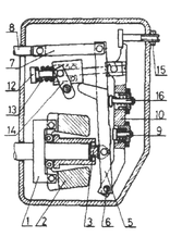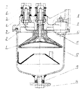 Для регулировки используется изменение величины центробежной силы вращающихся грузов. Корпус грузов 1, снабжен двумя качающимися грузами 2, опирается с помощью муфты 3, напрессованной в подшипнике регулирующей втулки, на сухарь или ролик промежуточного рычага 5, который в нижней части корпуса регулятора шарнирно закреплен на оси 6 и вторым концом с помощью тяги 7 соединен с регулирующей рейкой 8 топливного насоса. Промежуточный рычаг своей поверхностью опирается на регулируемый в осевом направлении корректор 9, встроенный в главном рычаге 10. Главный рычаг нижним концом шарнирно закреплен на совместной оси 6 вместе с промежуточным рычагом в корпусе регулятора. Верхним концом он соединен тягой 12 через нагрузочную пружину 13 с эксцентриковым валом 14. Рычагом управления, который установлен на эксцентриковом валу снаружи корпуса регулятора, через рычаги эксцентрикового вала и в них шарнирно установленную тарелку натягивается у всережимного регулятора нагрузочная пружина, в результате чего начинает действовать регулятор. Номинальная частота вращения регулятора дана настройкой упорного болта пальца рычага управления регулятора. Максимальная подача у регулятора ограничена регулируемым упором 15, ограничивающим ход главного рычага.