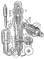 К нижнему концу корпуса форсунки гайкой 4 присоединен корпус распылителя 3, внутри которого находится запорная игла 2. Игла и корпус представляют пару. Корпус распылителя имеет четыре сонливых отверстия 1 диаметром 0,32 мм. В верхнем конце корпуса распылителя имеется топливораспределительный канал 6, соединенный с полостью корпуса распылителя тремя наклонивши каналами 5. Нижний конец штанги 9 упирается в хвостовик иглы 2 распылителя. Сверху на штангу напрессована опорная тарелка 10, в которую упирается пружина 11 форсунки. Усилие затяжки пружины регулируется винтом 12, ввернутым в гайку пружины 18, На гайку пружины навернут колпак 14 форсунки с шайбой 15. Топливо к форсунке подается через штуцер 17 и фильтр 16 и далее поступает через канал 7 к топливораспределительному каналу 6 в полость распылителя 3.