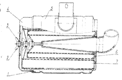 1 - уплотнительное кольцо; 2 - гайка барашек, 3 - шайба; 4 - крышка, 5 - корпус, 6 - контрольный фильтрующий элемент, 7 - основной фильтрующий элемент.