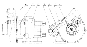 1 - ротор, 2 - корпус турбины; 3 - корпус подшипника; 4 - корпус компрессора; 5 - исполнительный механизм. 6-кронштейн крепления исполнительного механизма, 7 - воздухопровод.