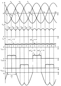 Диаграммы токов и напряжение рассматриваемой трёхфазной мостовой схемы выпрямления приведены на рис. 4.