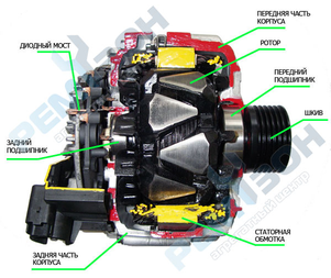 Синхронный генератор со встроенным выпрямителем, независимым возбуждением, когтеобразной (клювообразной) конструкцией ротора.