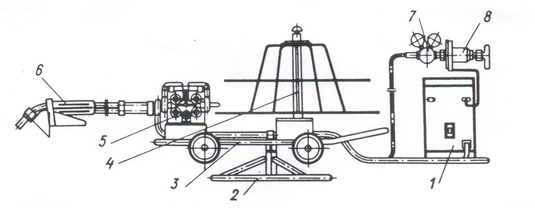 Тележка 3 установлена на подставке 2 и рассчитана на использование тогда, когда необходимо частое перемещение полуавтомата. В этом случае на ней устанавливается механизм подачи и фигурка для электродной проволоки. Кронштейн предназначен для работы в стационарных условиях. На нем устанавливается механизм подачи и катушка для сплошной проволоки.