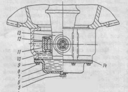 1 – брус шаровой связи; 2 – прокладки; 3 – сегментообразные упоры; 4 – валики; 5 – пробка; 6 – крышка; 7 – масло; 8 – болты; 9 –пружинные шайбы; 10 – латунная втулка; 11 – корпус; 12 – шар; 13 – шкворень; 14 – прокладка.