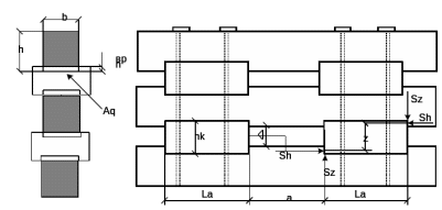 -расчетное скалывающее усилие, МН; z- расстояние между центрами тяжести площадок упора колодок в соединяемые элементы. м; la-длинна колодки, м.