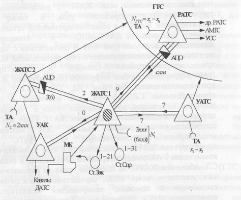 В соответствии с заданием на территории железнодорожного узла расположена ЖАТС 2 при железнодорожной станции и проектируемая (реконструируемая на базе цифрового оборудования) ЖАТС 1 при администрации ОД или УД. Обе ЖАТС связаны односторонними СЛ, образуя сеть абонентов с общей, закрытой нумерацией всех тысячных групп и выходом по исходящим соединительным линиям к ЖАТС 1 или ЖАТС2 в соответствии со знаком тысячи. Для выхода на междугородную ведомственную сеть ДАТС МПС проектируемая ЖАТС 1 подключается к узлу автоматической коммутации УАК по односторонним исходящими и входящим СЛ. Абоненты ЖАТС, не имеющие права на автоматическую междугородную связь МПС, осуществляют междугородное соединение с помощью телефонистки междугородного коммутатора (МК), предварительно заказав междугородный разговор через стол заказов по коду «О». Связь с общегосударственной сетью страны осуществляется через опорную районную АТС (РАТС) городской сети, которая, кроме связи с абонентами ГТС, обеспечивает выход абонентов ЖАТС на автоматическую междугородную телефонную сеть страны (АМТС) и спецслужбы ГТС (узел спецслужб - УСС). Местное соединение РАТС и ЖАТС обеспечивается по односторонним СЛ, причем для обеспечения высокого качества междугородней связи предусмотрен выделенный пучок междугородных линий СЛМ от опорной станции ГТС к проектируемой ЖАТС. При значительном тяготении абонентов проектируемой ЖАТС к учреждениям и предприятием, расположенным на территории данного населенного пункта, организуется прямая связь с УАТС, соответствующих учреждений по соединительным линиям с использованием индекса выхода 7 или 8.