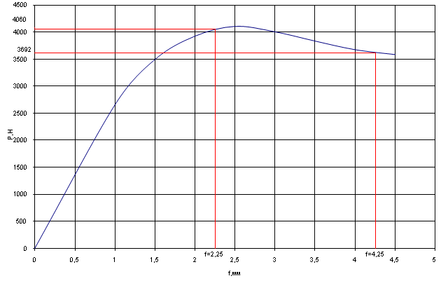 На графике значению PΣ = 3692 Н соответствует прогиб 0,00425 м. При износе накладки на 1 мм прогиб будет 0,00225 м. Этому значению соответствует PΣ = 4060Н.