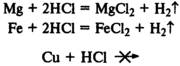 При реакции металлов с соляной кислотой, чем левее расположен металл в раду напряжений, тем быстрее протекает реакция, а металлы, находящиеся правее водорода, не реагируют вообще: