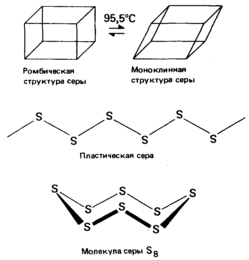 Например, углерод существует в виде алмаза либо графита. Сера существует в двух кристаллических формах - ромбической и моноклинной - в зависимости от температуры. Обе ее кристаллические формы являются примерами молекулярных кристаллов. Молекулы в них представляют собой гофрированные циклы, в каждом из которых содержится по восемь ковалентно связанных атомов серы. Твердая сера может существовать еще в третьей аллотропной форме как пластическая сера. Эта форма серы неустойчива. Она состоит из длинных цепочек атомов серы, которые при комнатной температуре разрушаются и снова образуют молекулы S8, кристаллизующиеся в ромбическую решетку.