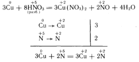 Эти реакции, в сущности, тоже представляют собой реакции замещения. В качестве примера приведем реакцию между медью и азотной кислотой. Медь вытесняет водород из кислоты. При этом происходит окисление меди, которая превращается в гидратированный катион, а содержащиеся в растворе кислоты гидратированные протоны азота восстанавливаются, образуя оксид азота.