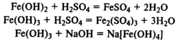 Гидроксиды железа. Fe(ОН)2 — типичный основной оксид, Fe(ОН)3 обладает амфотерными свойствами, реагирует не только с кислотами, но и с концентрированными растворами щелочей.