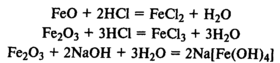 Соединения железа. FeО — основной оксид, реагирует с растворами кислот с образованием солей железа (II). Fe2О3 — амфотерный оксид, реагирует также с рас творами щелочей.