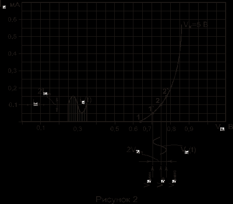 Имея постоянную составляющую IБО= 0,1 мА, строим на этом уровне изменение базового тока iБ(t), т. е. сумму переменного и постоянного составляющих (на рис.3 заштриховано). Соответствующее изменение базового напряжения, с пределами изменения VБмин и VБмах на уровне VБ0, показана на нижней части этого рисунка.