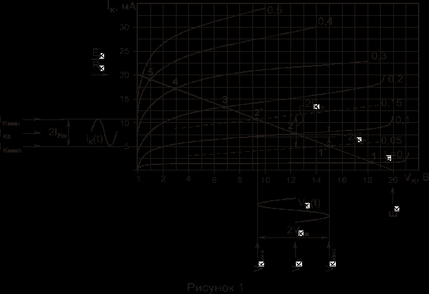 Аналогичное построение осуществляется и на выходной характеристике транзистора относительно уровней IК0 и VК0 c амплитудами IКМ и VКМ.