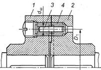 T↓ T При увеличении ω, тем меньше давление пружины 26.Предохранительные муфты. Расчет передаваемого момента (предельного) Эти муфты допускают ограничение передаваемого вращающего момента, что предохраняет машины от поломок при перегрузках. Наибольшее распространение получили предохранительные кулачковые, шариковые и фрикционные муфты (рис.16). Рис.16. Предохранительные муфты От сцепных и других муфт они отличаются отсутствием механизма включения. Предохранительные кулачковые и шариковые (рис.16, а) муфты постоянно замкнуты, а при перегрузках кулачки или шарики полумуфты 1 выдавливаются из впадин полумуфты 2, и муфта размыкается. Иначе работает предохранительная фрикционная муфта (рис.16, б). При перегрузке за счет проскальзывания происходит пробуксовывание этой муфты (останавливается ведомый вал). Рассмотренные на рис.16 предохранительные муфты применяют при частых перегрузках. При маловероятных перегрузках применяют предохранительные муфты с разрушающимся элементом, например со срезным штифтом (рис. 17). Такая муфта состоит из дисковых полумуфт 1 и 2, соединяемых металлическим штифтом 3, вставленным в термически обработанную втулку 4. При возникновении перегрузки штифт срезается, и муфта разъединяет валы. Они просты по конструкции и малогабаритны. Рис. 17. Муфта предохранительная со срезным штифтом: 1,2— полумуфты; 3 — срезной штифт; 4 — закаленные втулки Для изготовления деталей предохранительных муфт в зависимости от типа муфты применяют конструкционные стали, чугун СЧЗО, фрикционные материалы, сталь ШХ12 и др. Штифты для муфт с разрушающимся элементом изготовляют из стали 45, втулки — из стали 40Х с закалкой. Расчет фрикционных муфт. Необходимое осевое усилие Фрикционные муфты (рис.13) в отличие от кулачковых, допускают включение на ходу под нагрузкой. Фрикционные муфты передают вращающий момент за счет сил трения. Фрикционные муфты допускают плавное сцепление при любой скорости, что успешно используется, например, в конструкции автомобильного сцепления. Кроме того, фрикционная муфта не может передать через себя момент больший, чем момент сил трения, поскольку начинается проскальзывание контактирующих фрикционных элементов, поэтому фрикционные муфты являются эффективными неразрушающимися предохранителями для защиты машины от динамических перегрузок. По конструкции фрикционные муфты делят на: дисковые, в которых трение происходит по торцевым поверхностям дисков (одно- и многодисковые) (см. рис.13, а); конусные, в которых рабочие поверхности имеют коническую форму (рис.13.10, б); цилиндрические имеющие цилиндрическую поверхность контакта (колодочные, ленточные и т.д.) (рис.13.10, в). Наибольшее распространение получили дисковые муфты. Фрикционные муфты работают без смазочного материала (сухие муфты) и со смазочным материалом (масляные муфты). Последние применяют в ответственных конструкциях машин при передаче больших моментов. Смазывание уменьшает изнашивание рабочих поверхностей, но усложняет конструкцию муфты. Материал для фрикционных муфт — конструкционные стали, чугун СЧ30. Фрикционные материалы (прессованную асбесто-проволочную ткань — ферродо, фрикционную пластмассу, порошковые материалы и др.) применяют в виде накладок. Рис. 13. Фрикционные муфты: а — дисковая; б — конусная; в — цилиндрическая Главной особенностью ра