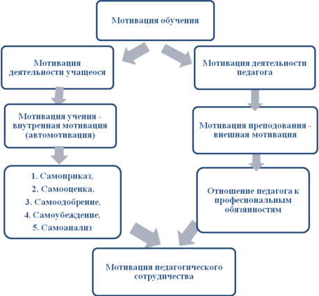 Мотивация обучения - это общее название для процессов, методов, средств побуждения учащихся к продуктивной познавательной деятельности, к активному освоению содержания образования. Образно говоря, образы мотивации держат в своих руках совместно преподаватели (мотивация обучения, их отношение к профессиональным обязанностям) и учащиеся (мотивация учения, внутренняя, автомотивация).2