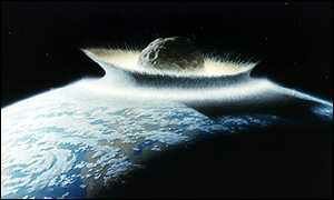 ожно представить, как бы выглядела бы подобная катастрофа. При приближении к Земле, тело начало бы увеличиваться в размерах. Сначала почти незаметная звезда за короткий срок сменила бы свой блеск на несколько звёздных величин, превратившись в одну из самых ярких звёзд на небе. При кульминации, она своими размерами на небе практически равнялась бы с Луной. При входе в атмосферу, тело обладающее 1- 2ой космической скоростью вызвало бы резкое сжатие и разогрев близлежащих масс воздуха. Если тело имело пористую структуру, то был бы возможен его раскол на более мелкие части, и сгорание основной массы в атмосфере Земли, если нет то произошёл бы только разогрев внешних слоёв тела, небольшое замедление скорости и после столкновения образование единственного кратера больших размеров. При втором варианте событий последствия для жизни на планете были бы апокалипсичны. Разумеется многое зависит от размеров тела. На существование разумной жизни может поставить крест столкновение даже с малым телом, обладающим около нескольких сот метров в диаметре, столкновение с телами большего размера может практически уничтожить жизнь вообще. Полёт тела в атмосфере сопровождался бы звуком похожим на звук от реактивного двигателя, увеличенного в несколько раз. За телом остался бы яркий хвост, образованный сверхразогретыми газами, что представляло бы неописуемое зрелище. При первом варианте на небе были бы видны тысячи болидов, а само зрелище было бы похоже на метеоритный дождь, только заметно превосходило его по силе. Последствия были бы не так катастрофичны как при первом варианте, но крупные болиды, достигнув земной коры, могли бы вызвать некоторые разрушения небольшого масштаба. При попадании крупного тела в земную кору, образовалась бы мощная ударная волна, которая, слившись с волной образовавшийся ещё при полёте, сравняла бы с землёй огромную площадь поверхности. При попадании в океан, поднялась бы мощная волна цунами, которая смыла бы всё с территорий, находящихся в нескольких сотнях километров от береговой линии. На стыке тектонических плит произошли бы сильные землетрясения и извержения вулканов, что повлекло бы новые цунами и выбросы пыли. На много лет на планете установился бы ледниковый период, а жизнь была бы откинута к начальным её формам. Если динозавры вымерли всё-таки по причине столкновения космического тела с Землёй, то оно, скорее всего, имело небольшие размеры и цельную структуру. Это подтверждает неполное уничтожение жизни, несущественное похолодание климата, а также наличие единственного кратера, предположительно в районе Мексиканского залива. Не исключено, что подобные события происходили не раз. В подтверждение этого некоторые учёные приводят в пример некоторые образования на поверхности Земли.