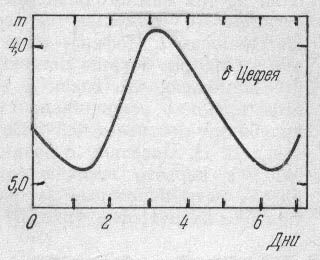 Сделав в течение двух-трех недель десяток оценок, постройте график изменения блеска звезды δ Цефея: по его горизонтальной оси отложите моменты времени, по вертикальной — видимый блеск. Чем больше будет сделано наблюдений, тем более явным станет периодический характер изменения блеска δ Цефея .