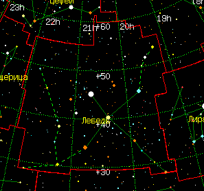В созвездии Лебедя недалеко от звезды  впервые была обнаружена черная дыра - объект, который будоражит умы астрономов и физиков вот уже свыше 200 лет. На существование черных дыр (правда, тогда их так не называли) одним из первых указал еще в XVIII в. Лаплас. Свои рассуждения он основывал на законе всемирного тяготения. Действительно, мы знаем, что для того, чтобы космический аппарат или какое-либо другое тело навсегда покинуло Землю, ему необходимо сообщить вторую космическую скорость (астрономы называют ее параболической), равную 11,2 км/с. При меньшей скорости тело упадет на Землю или станет ее спутником. Чтобы улететь с Юпитера, телу нужно сообщить параболическую скорость, равную уже 60,4 км/с, с Солнца - около 600 км/с. А представьте себе небесное тело, покинуть которое можно лишь имея параболическую скорость, не меньшую скорости света, т. е. 300 000 км/с. Поскольку ничто в природе не может двигаться со скоростью, большей скорости света, такое небесное тело будет все в себя втягивать и ничего не будет выпускать, даже свет. Получается нечто вроде дыры в космосе. Так как такие черные дыры не светятся, никто не ожидал их увидеть на небе при телескопических наблюдениях. Однако в начале 70-х гг., когда в космос запустили рентгеновский телескоп, астрономы увидели излучение небесных тел в диапазоне волн, не доступном для наблюдений с поверхности Земли из-за сильного поглощения в атмосфере. С помощью такого телескопа недалеко от Лебедя и был замечен странный быстропеременный рентгеновский источник Лебедь Х-1. Х - обозначение рентгеновских, или Х-лучей. Как оказалось, он обращается с периодом около 5,6 суток вокруг обычной очень массивной и горячей звезды. Быстрая переменность указывала на очень маленькие размеры источника (менее 1000 км). Звезды с такими размерами науке не известны. Наблюдения оптического излучения главной звезды показали периодические (с тем же периодом) смещения ее спектральных линий, благодаря чему удалось оценить массу невидимого рентгеновского источника, которая оказалась в 10 раз больше солнечной массы. Первое предположение, что этот загадочный объект является нейтронной звездой, сразу было отвергнуто, так как нейтронные звезды имеют массы не более нескольких солнечных масс. Ученые пришли к выводу, что рентгеновские лучи излучает черная дыра, радиус которой всего около 30 км. Но ведь черная дыра сама ничего излучать не может. Как же тут быть с рентгеновским излучением? Как показали исследования, благодаря тому, что черная дыра обращается вокруг гигантской горячей обычной звезды, она своим притяжением как бы перетягивают ее вещество. Это вещество, перед тем как упасть и исчезнуть в черной дыре, образует вокруг нее очень горячий, нагретый до миллионов градусов диск, рентгеновское излучение которого мы и наблюдаем. Сам диск по форме напоминает кольцо вокруг планеты Сатурн. Теперь нам нетрудно представить строение объекта Лебедь Х-1: яркая горячая звезда радиусом в несколько миллионов километров, а вокруг нее с огромной скоростью обращается черная дыра радиусом около 30 км, окруженная диском из горячего вещества, вытянутого из главной звезды.