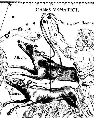 В 1725 Эдмон Галлей дал Альфе Гончих Собак имя Сердце Карла (Cor Caroli) в честь английского короля Карла II. Это красивая двойная звезда, один из компонентов которой желтый, а другой - фиолетовый. Интерестна также спиральная галактика М51, доступная для наблюдения в хороший бинокль (9-ая звездная величина) и расположенная в 3о к юго-западу от последней звезды "хвоста" Большой Медведицы. Расстояние до галактики 23 млн. световых лет. На конце ее спирального рукава видна галактика-компаньон.