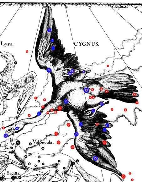 "Денеб" по-арабски означает "хвост курицы"; это бело-голубой сверхгигант со светимостью в 67000 раз выше солнечной. В Млечном Пути вблизи Денеба видна темная область - Северный Угольный Мешок. Звезда в "голове птицы", Альбирео ( Лебедя) - великолепная визуальная двойная с желтым и голубым компонентами. Другая интересная звезда - 61 Лебедя, очень похожая на Солнце и одна из ближайших к нам звезд.