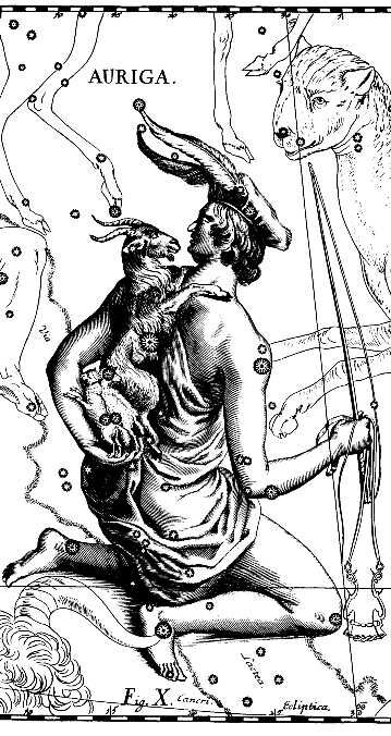 Ярчайшую звезду в нем шумеры, а вслед за ними греки и арабы называли "звездой козы", а римляни - "маленькой козочкой", Капеллой. Это спектральная двойная с периодом 104 суток. Расстояние до нее 45 световых лет; ее светимость в 150 раз выше солнечной. В этом созвездии три прекрасных рассеянных скопления: М36, М37 и М38.