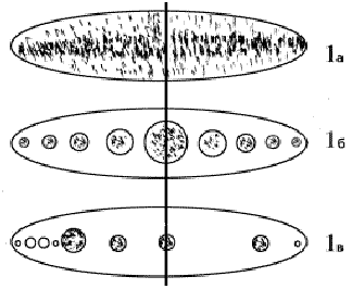 имметрично рассекала его на две равные по длине части (рис.1а), то половина планет с половинной суммарной массой вещества должна бы находиться по одну сторону от симметричной линии, а другая половина - по другую сторону, как показано на рис.1б. Но на рис.1в мы видим совсем другую картину. А именно так и распределена масса вещества между планетами и их орбитами.