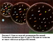 В соответствии с современными космологическими концепциями, Вселенная расширяется, но центр расширения отсутствует: из любой точки Вселенной картина расширения будет представляться той же самой, а именно, все галактики будут иметь красное смещение, пропорциональные расстоянию до них (рис.4). Само пространство как бы раздувается.