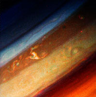 В отличие от Юпитера полосы на Сатурне доходят до очень высоких широт - 78 градусов. Гигантское овальное образование размером с Землю, расположенное недалеко от северного полюса, названо Большим Коричневым Пятном, так ж
