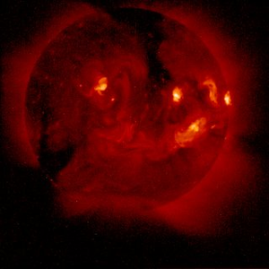Самое мощное проявление солнечной активности – это вспышки. Они происходят в сравнительно небольших областях хромосферы и короны, расположенных над группами солнечных пятен. По своей сути вспышка – это взрыв, вызванный внезапным сжатием солнечной плазмы. Сжатие происходит под давлением магнитного поля и приводит к образованию длинного плазменного жгута или ленты. Длинна такого образования составляет десятки и даже сотни тысяч километров. Общее количество энергии, выделяющееся в результате взрыва, может составлять в зависимости от его силы от 1023 до 1025 Дж. Продолжается вспышка обычно около часа.